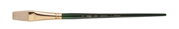 Длинная ручка кисти покрыта глянцевым лаком изумрудного цвета. В пучке преобладают волоски с расщепленным кончиком, поэтому кисть одинаково хорошо наполняется и отдает краску. Упругий и прочный свиной волос отлично подходит для работы с тяжелыми масляными и акриловыми красками. Щетина износоустойчива к сильным растворителям.