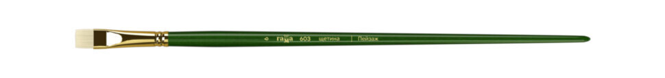 Длинная ручка кисти покрыта глянцевым лаком изумрудного цвета. В пучке преобладают волоски с расщепленным кончиком, поэтому кисть одинаково хорошо наполняется и отдает краску. Упругий и прочный свиной волос отлично подходит для работы с тяжелыми масляными и акриловыми красками. Щетина износоустойчива к сильным растворителям.