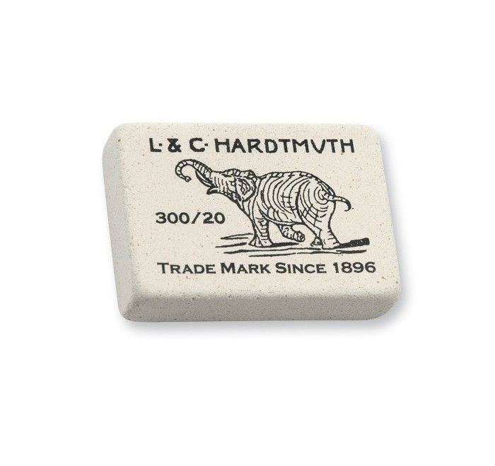 Известный ластик со слоном. Изготовлен из каучука, универсален. Отлично стирает линии графиитовых карандашей любой твердости.